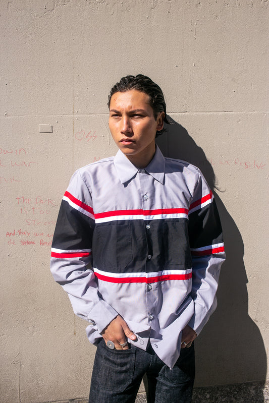 Red & Black Stripe Grey Long Sleeve Button Up